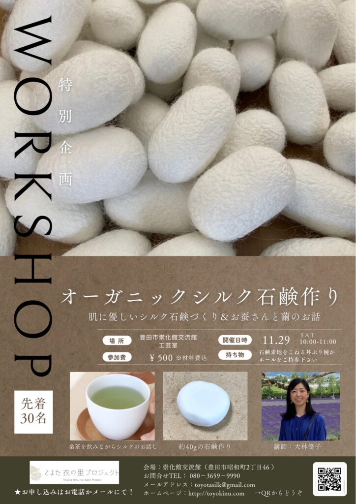 11月29日(土)シルク石鹸づくり体験会について 投稿者: toyokinu2025年10月22日2025年10月22日news、お知らせ、ブログ、未分類 来月11月29日(土)10時~11時予定で豊田市崇化館交流館工芸室にて お蚕さんのお話とシルク石鹸づくり体験会を行います。 この機会にシルクの良さを知っていただけたら嬉しいです。 詳細は添付チラシをご確認ください。 お申込み(お問い合わせ)は 電話(080-3659-9990)もしくはtoyotasilk@gmail.comまでお願いいたします。